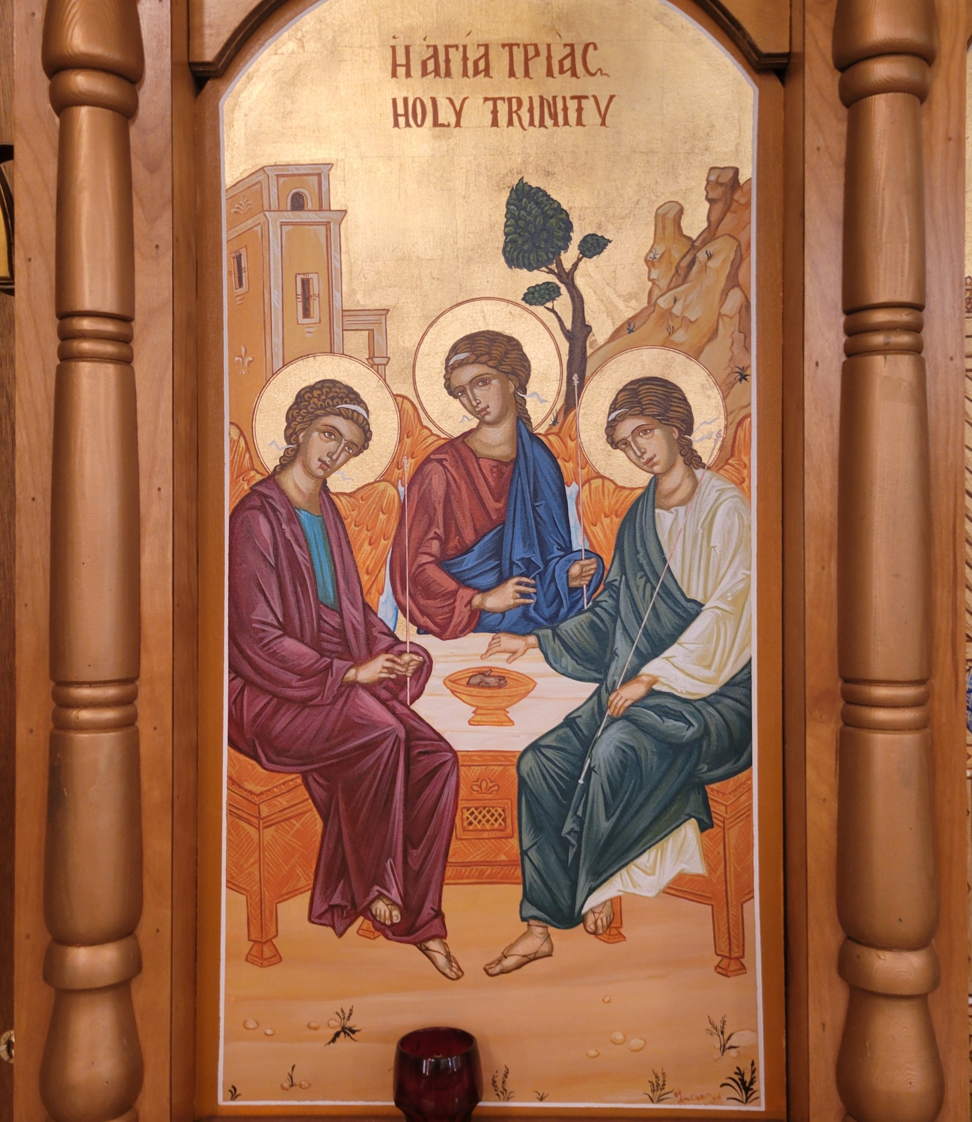 The Hospitality of Abraham (also called Trinity) is a Russian icon by Andrei Rublev that shows the three angels that appeared to Abraham at Mamre. Though the three angels are not the three persons of the Trinity, the three angels represent the Trinity. The angel in the middle represents Christ, the Son of God with the chalice used in the Eucharist. Our church celebrates it's Patronal Feast during the celebration of Holy Pentecost.